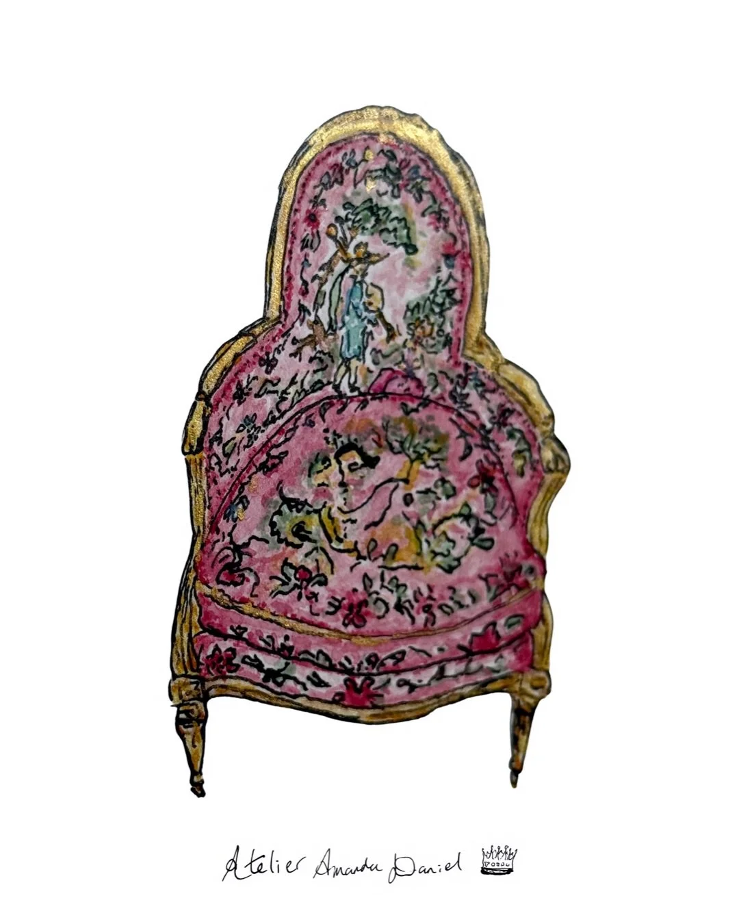 French line drawing, ink dip fountain pen & watercolour by Amanda Daniel.